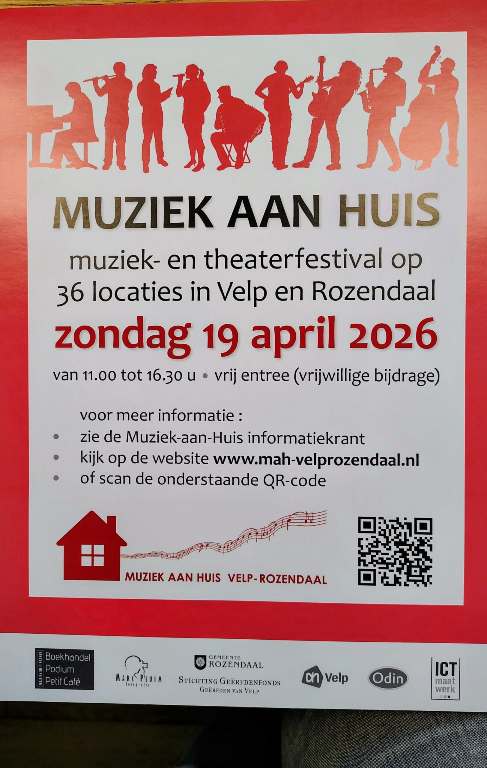 Zondagmiddag 19 april is het zover! Van 11 tot 17 uur kun je op 36 verschillende locaties in Velp en Rozendaal luisteren en genieten van muziek, verhalen en toneel. Plaatselijke muzikanten, artiesten en acteurs zingen of vertellen hun verhaal. Het zijn steeds optredens van 30 minuten, met 30 minuten pauze om naar een volgende locatie te wandelen of fietsen.